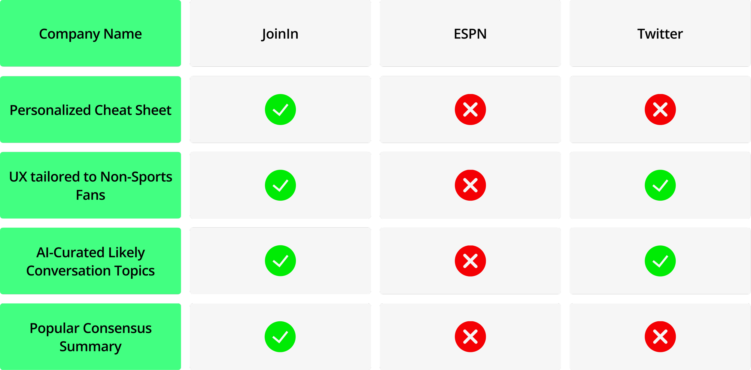This analysis compares JoinIn with leading platforms like ESPN and Twitter. Key features include a personalized cheat sheet, a user experience tailored to non-sports fans, AI-curated topics likely to come up in conversation, and concise summaries of public opinion. By evaluating these features, JoinIn reveals a clear opportunity to serve casual users with a faster, more approachable way to stay informed and join sports conversations confidently.