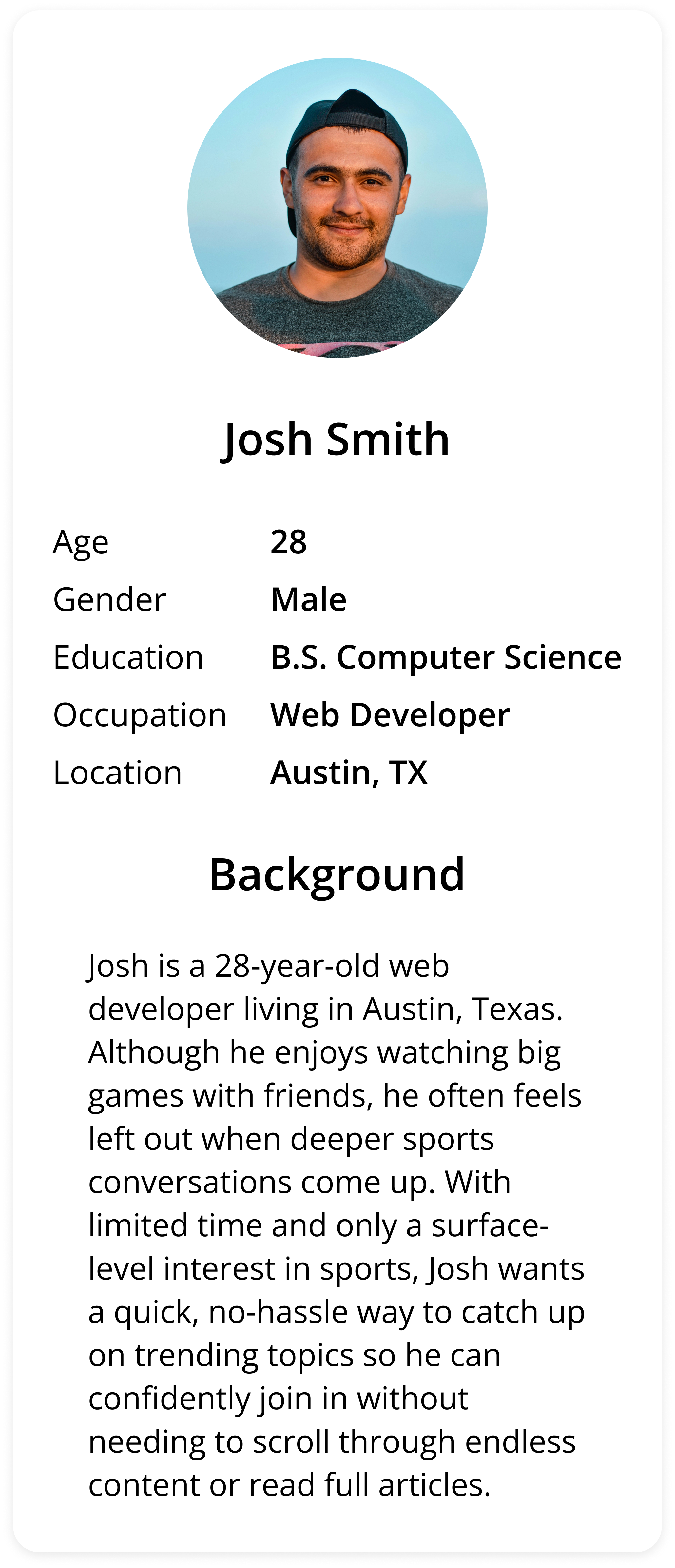 The user empathy map reflects Josh’s experience as someone who enjoys being social but often feels excluded when sports come up. By understanding his habits, frustrations, and desire to stay informed without investing too much time, the app was shaped to help him confidently join conversations with minimal effort.